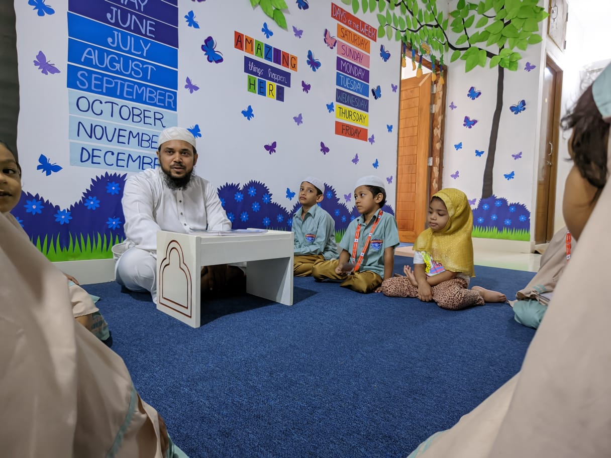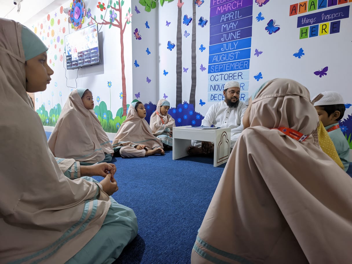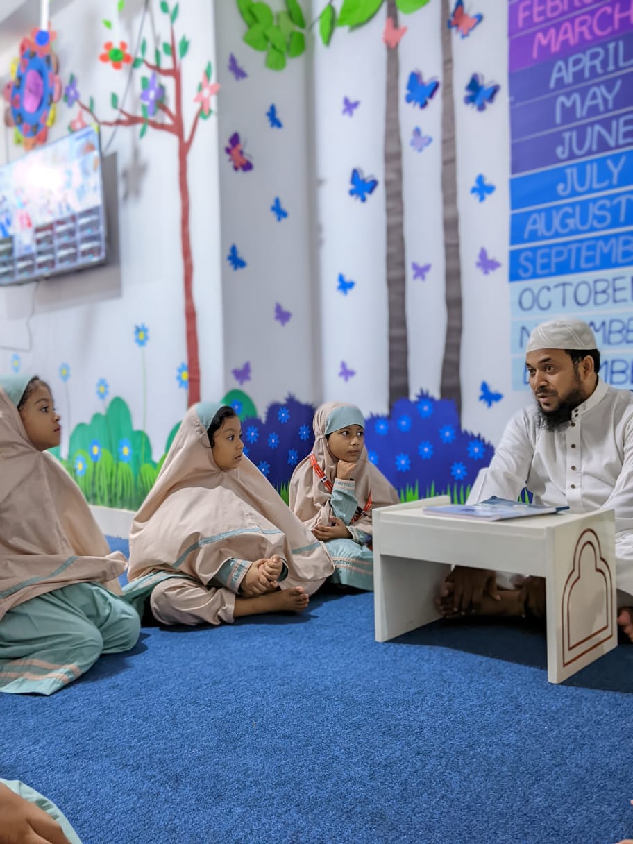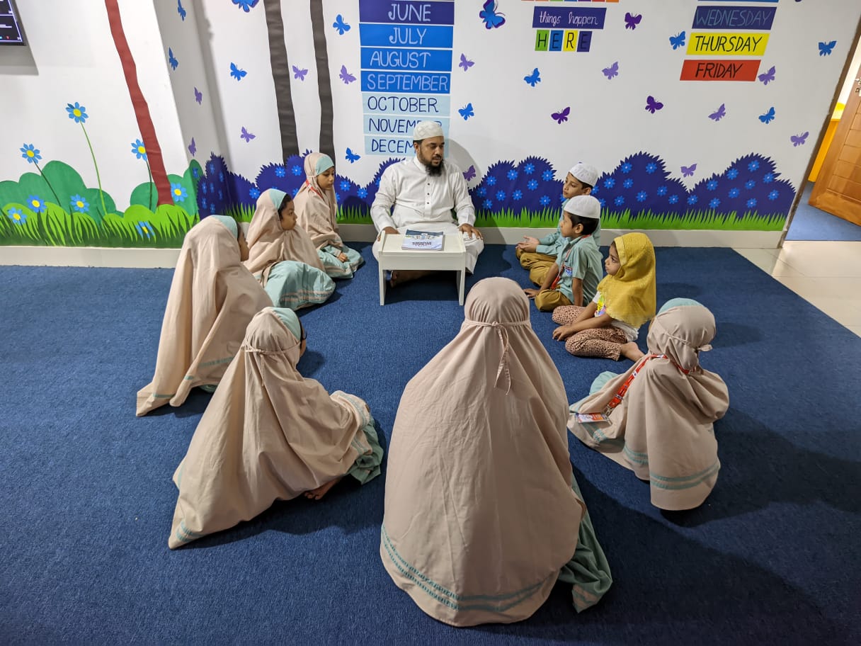 As part of our tarbiyah (Islamic upbringing) sessions, Ustadh Hossain Madani is teaching a class on the significance of offering “Salam” (greetings of peace) in Islam, highlighting it’s rules (ahkams) through role play. At BIS, we emphasize practical teaching methods to instill Islamic values in our students’ lives, encouraging them to actively practice and spread Islam.
